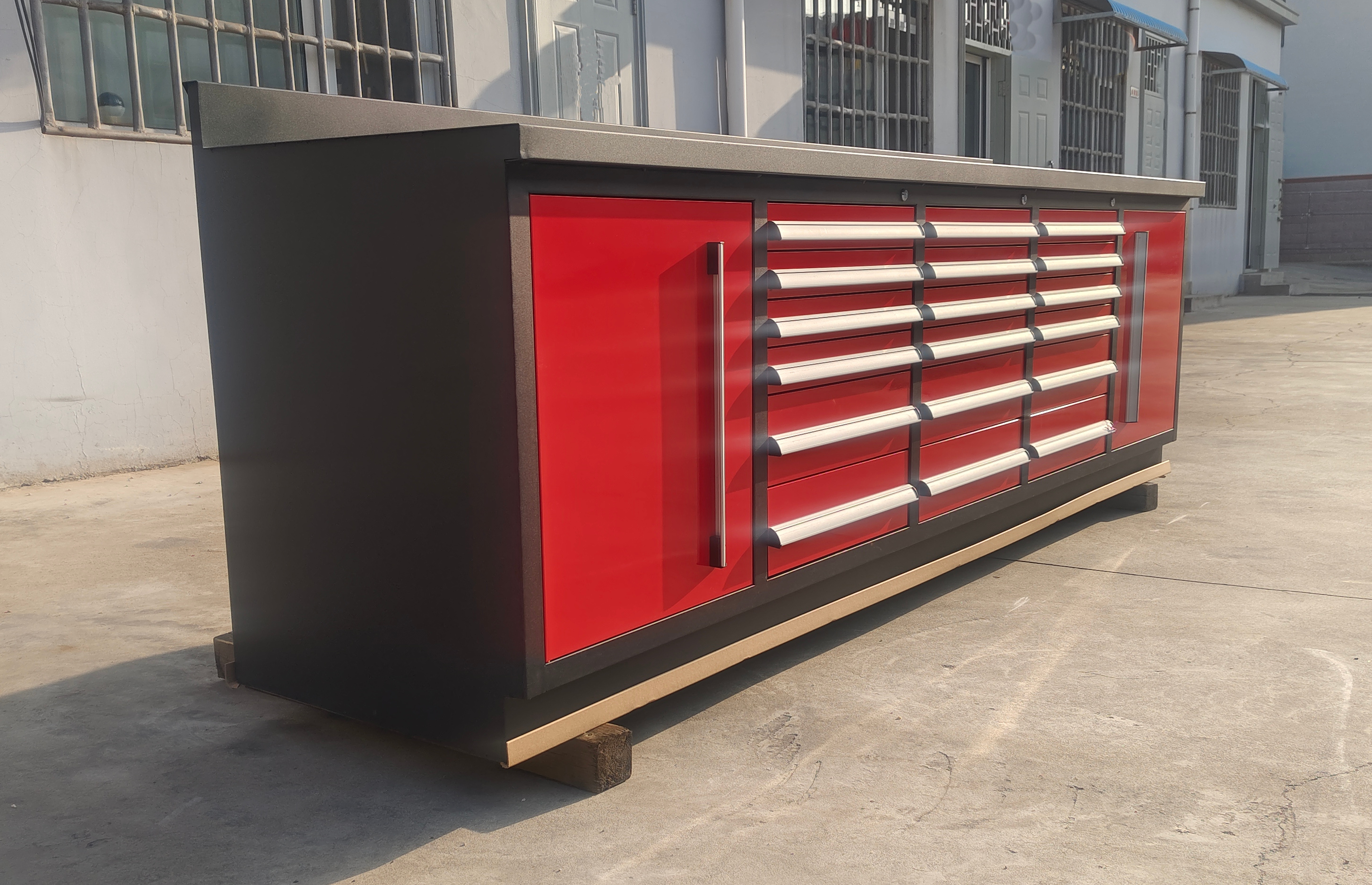 Dielenský ponk 18 red má 18 šuplíkov a 2 skrinky. Všetky šuplíky sú na guličkových pojazdoch. Nosnosť jednotlivých šuplíkov je 50kg. Oplechovanie ponku je z 1,0 mm plechu. Pracovná doska je z plechu o sile 1,5mm v celej ploche podložená drevenou doskou o sile 40mm. Celková hmotnosť ponku je 250kg. Výšku police v bočných skrinkách je možné užívateľsky posúvať hore/dole.. Horná hrana pracovnej dosky je vo výške 86cm. Hĺbka pracovnej plochy je 66cm. Nejedná sa o stavebnicu, ponky dodávame ako jeden zvarenec, šuplíky je možné užívateľsky demontovať. Farba na všetky časti je nanášaná práškovým lakovaním (komaxitom).