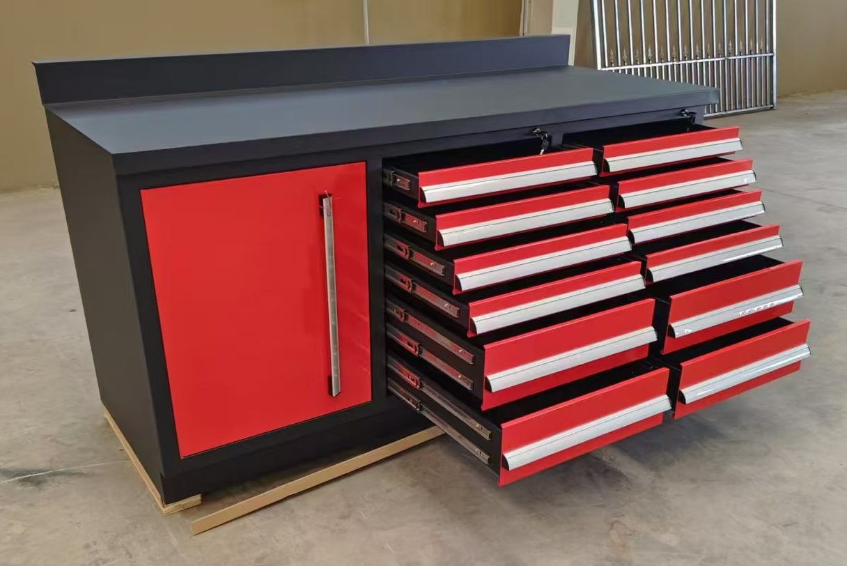 Dielenský ponk 12 red má 12 šuplíkov a 1 skrinku na ľavej strane. Konštrukcia vychádza z väčšieho modelu dĺžky 285cm, ktorá je skrátená o dva stĺpce. Vznikol tak kompaktný krásny ponk, ktorý sa zmestí naozaj všade. Všetky šuplíky sú na guličkových pojazdoch. Nosnosť jednotlivých šuplíkov je 50kg. Oplechovanie ponku je z 1,0 mm plechu. Pracovná doska je z plechu o sile 1,5mm v celej ploche podložená drevenou doskou o sile 40mm. Celková hmotnosť ponku je 153kg. Výšku police v bočnej skrinke je možné užívateľsky posúvať hore/dole. Horná hrana pracovnej dosky je vo výške 86cm. Hĺbka pracovnej plochy je 66cm. Nejedná sa o stavebnicu, ponky dodávame ako jeden zvarenec, šuplíky je možné užívateľsky demontovať. Farba na všetky časti je nanášaná práškovým lakovaním (komaxitom).